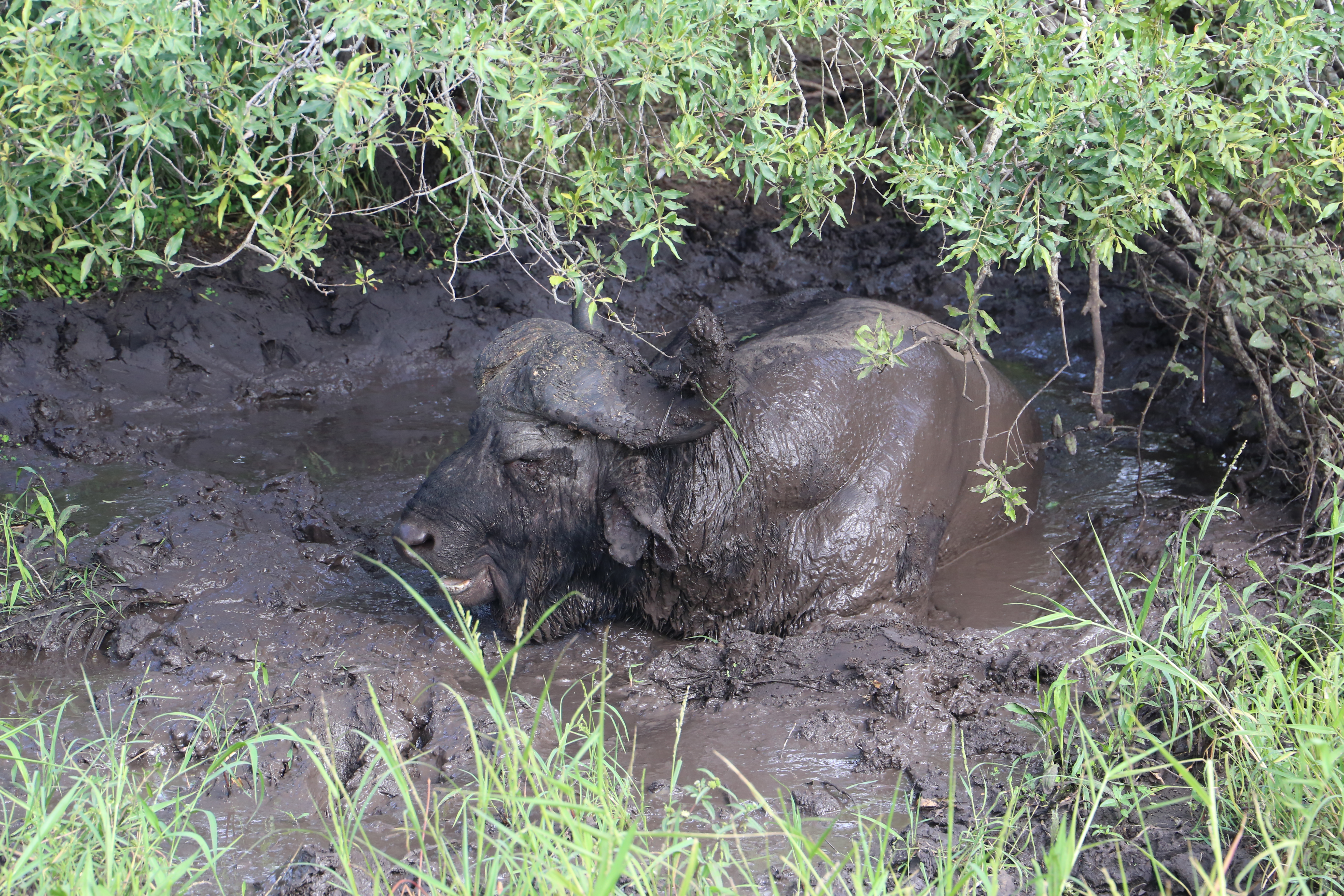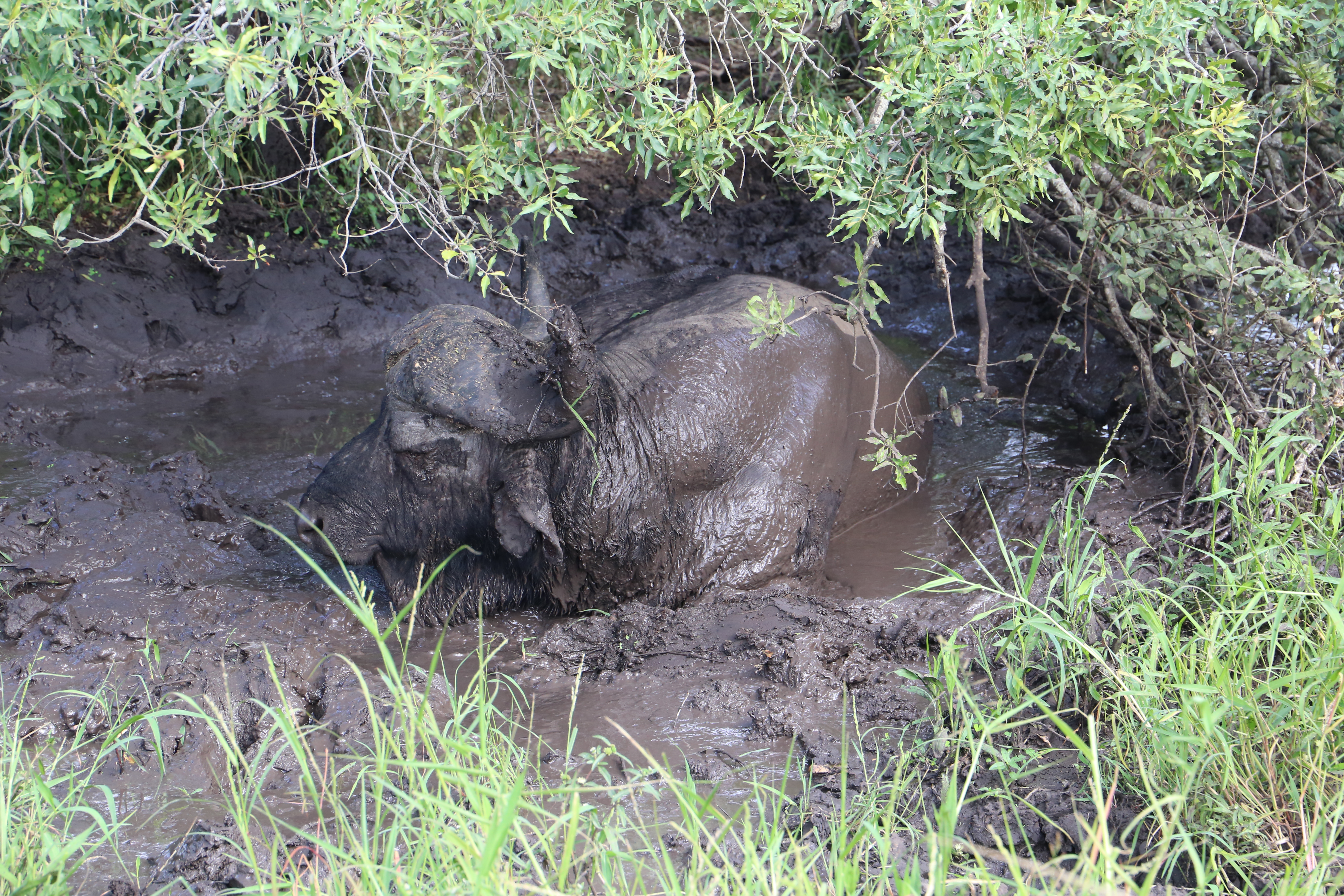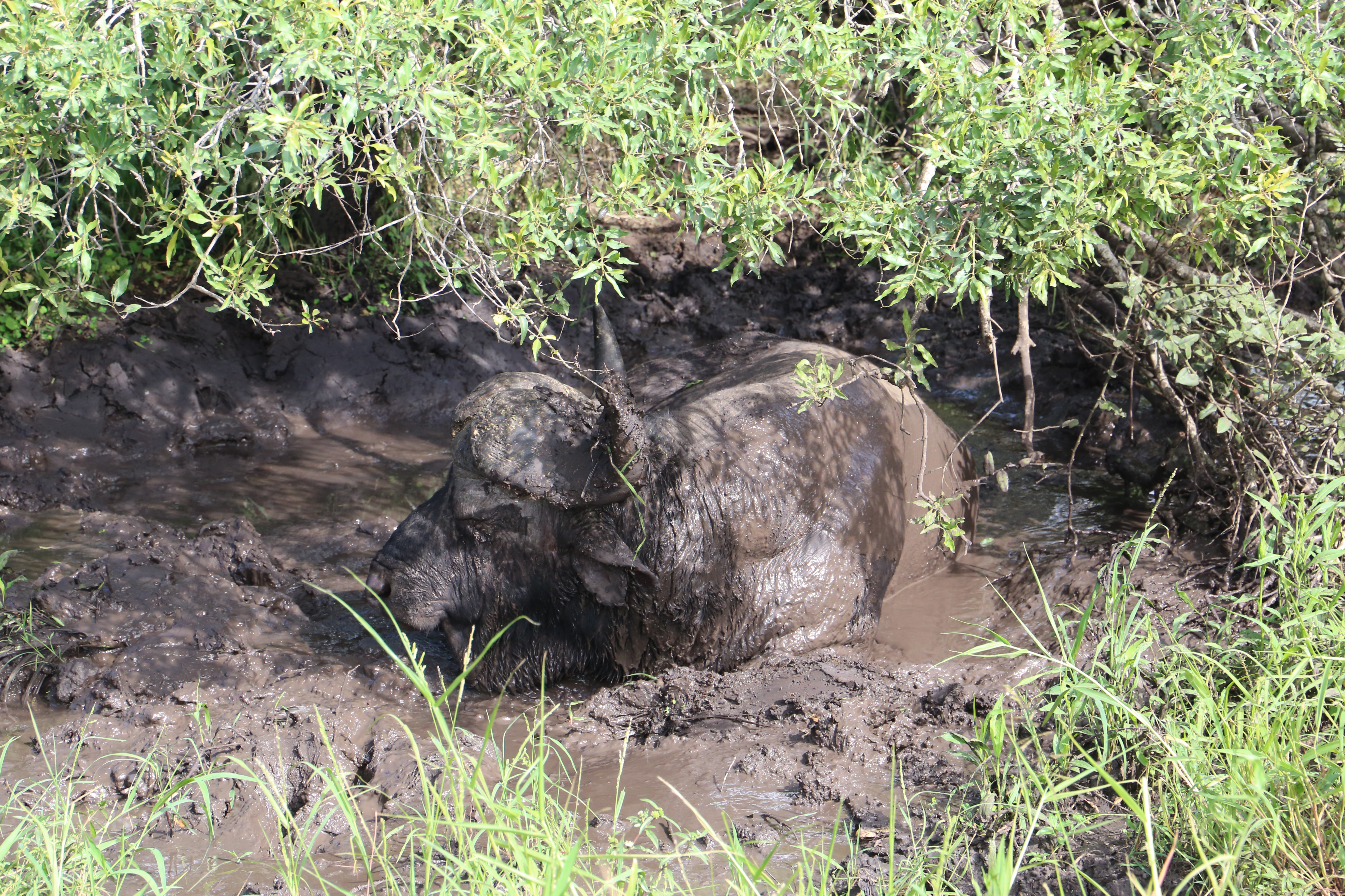 We saw a buffalo cooling off in muddy water.