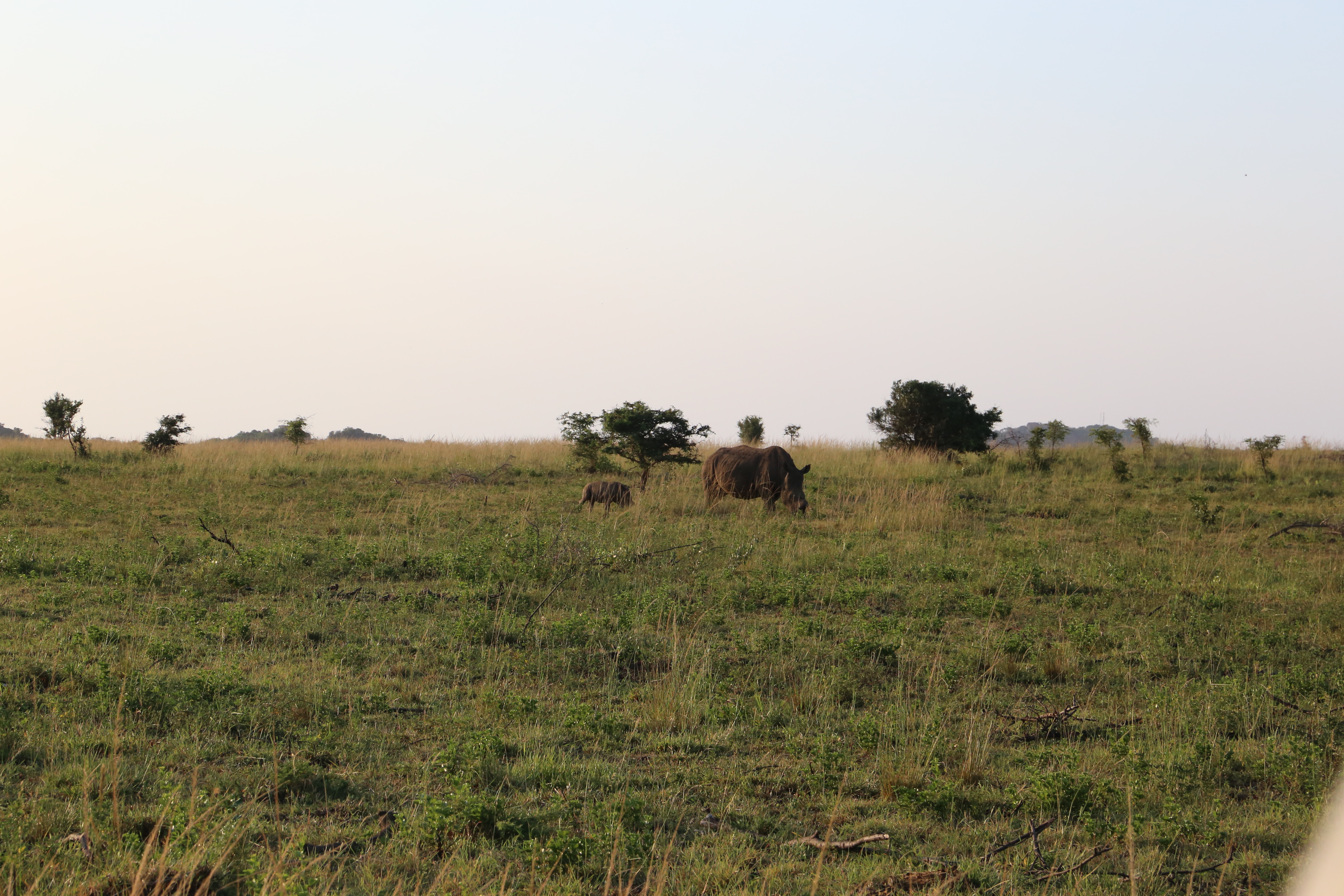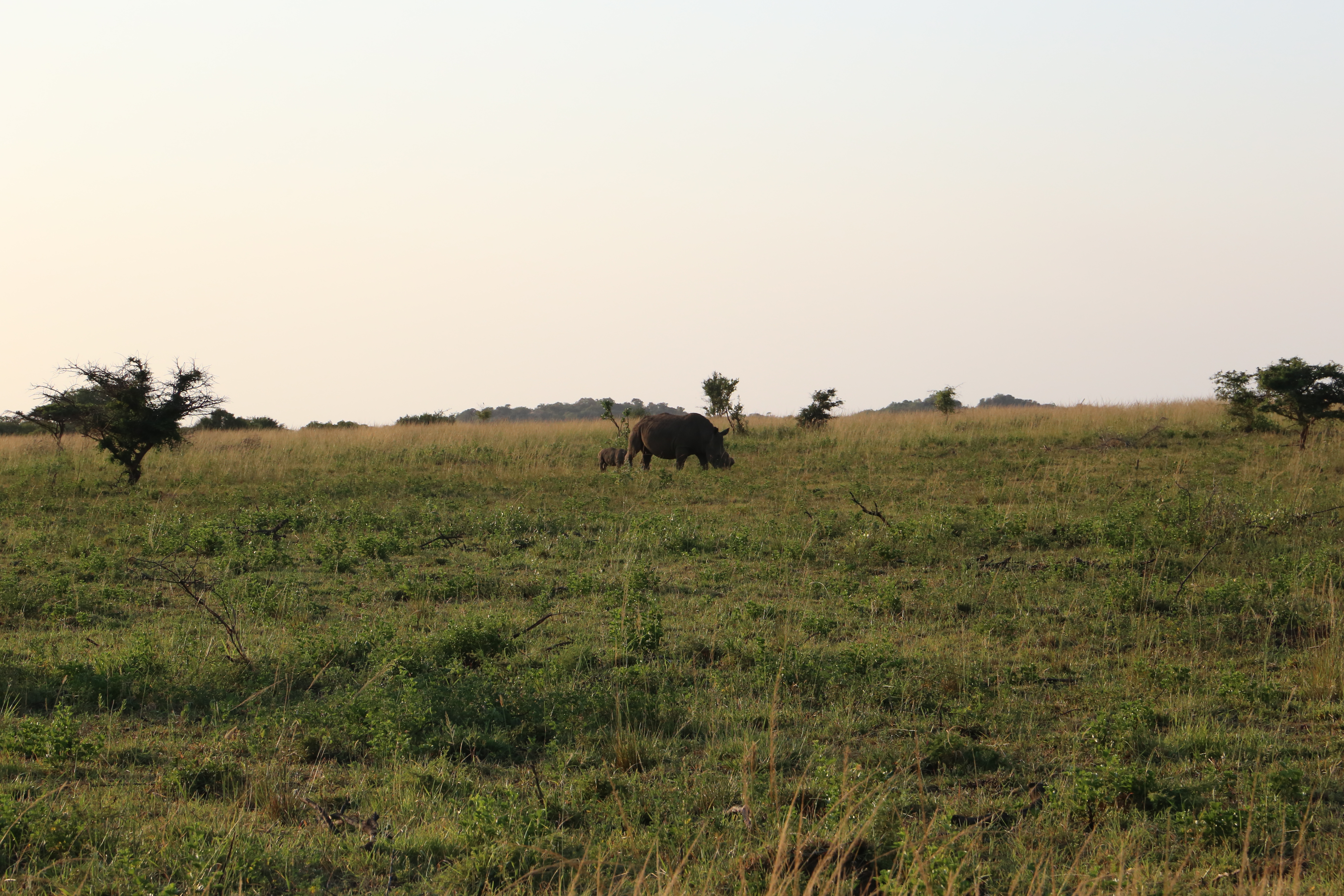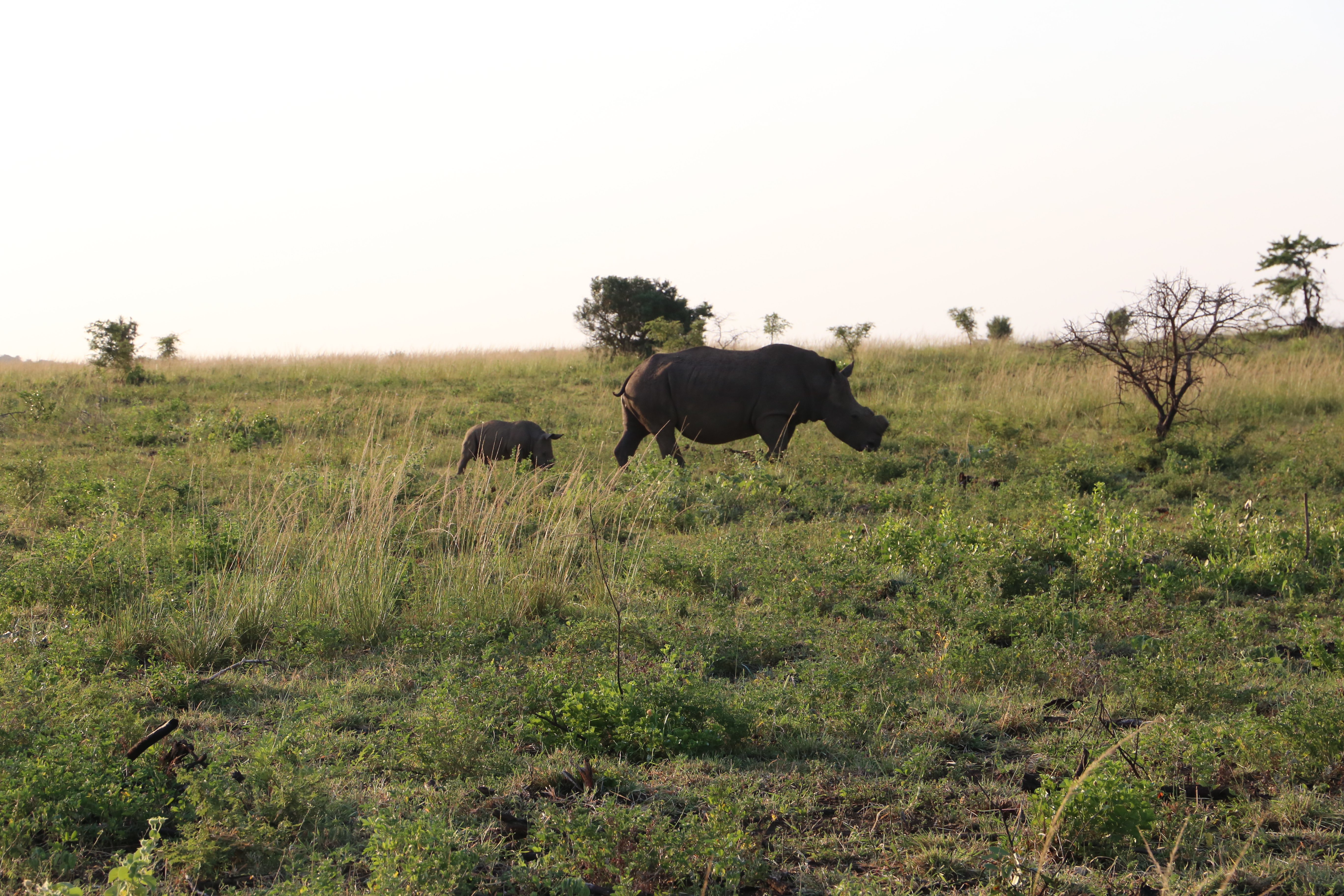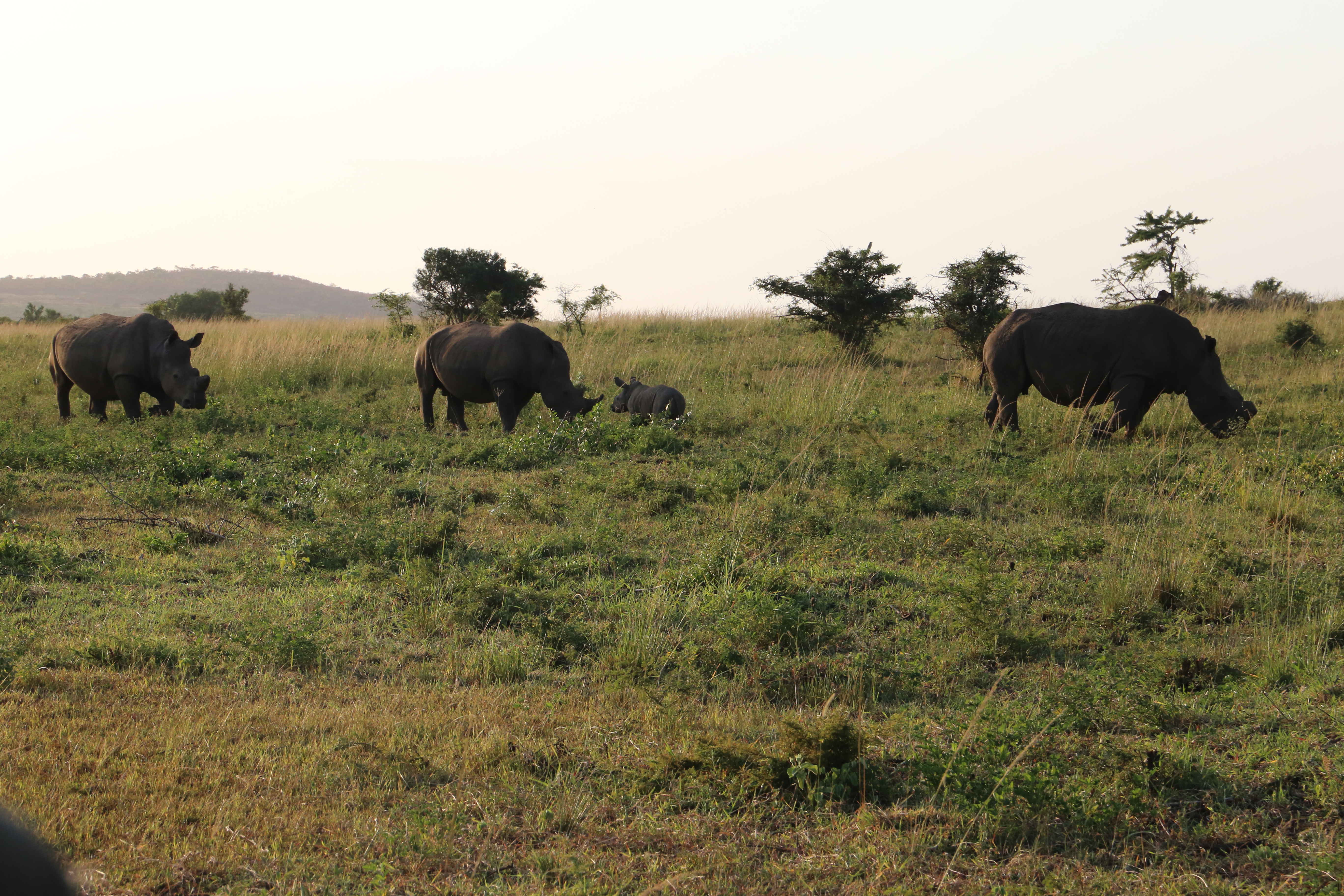 We saw a rhino mother and calf. They were joined by two other rhino. The calf went to play with them.